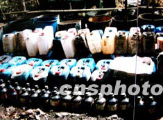 <div=left>中緬警方合作在春季行動中摧毀金三角一個毒品加工廠,繳獲大量毒品及槍支彈藥。圖為該次行動中繳獲的部分制毒化學配劑。作者:張磊