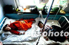 “三一九”豆奶事件后二十天,五歲的史雨平(右)與六歲的王秀文仍在海城市中心醫(yī)院打點滴。當?shù)卣Q,自3月19日當?shù)?所小學學生飲用豆奶以來,先后已有2500多名學生出現(xiàn)了腹痛、頭暈、惡心等不良反應。作者:鄭萍萍
