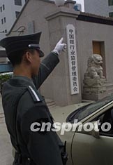 中國銀行業(yè)監(jiān)督管理委員會二十八日正式掛牌。銀監(jiān)會將行使原由中國人民銀行履行的監(jiān)督管理職權(quán)。圖為武警戰(zhàn)士在銀監(jiān)會門前執(zhí)勤。作者:毛建軍