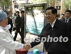 官方消息說,5月1日,胡錦濤和隨行的中共中央政治局委員、國務院副總理兼衛生部部長吳儀等在天津檢查防治非典型肺炎工作的落實情況,親切慰問為防治疫病辛勤工作的廣大干部群眾、醫務工作者和科研人員。