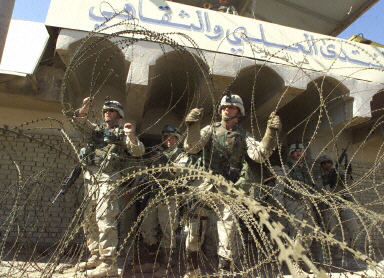 在巴格達(dá)以西50公里處的費(fèi)盧杰鎮(zhèn),美軍30日再次向舉行反美示威游行的伊拉克平民開(kāi)槍射擊,至少造成3名伊拉克人死亡。圖為美軍在費(fèi)盧杰鎮(zhèn)指揮部外用鐵絲建防護(hù)墻。