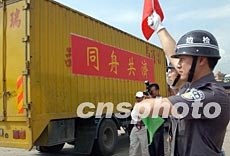 中央政府支援香港抗炎醫用物品交接儀式,五月八日在深圳皇崗口岸舉行, 滿載著抗炎物品的八輛集裝箱車從深圳皇崗口岸出發運抵香港。中新社記者 錢興強 攝