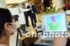 工作人員在會(huì)場(chǎng)外用紅外熱像儀對(duì)每一位進(jìn)入會(huì)場(chǎng)的人員進(jìn)行體溫測(cè)試,以確保會(huì)場(chǎng)環(huán)境安全。