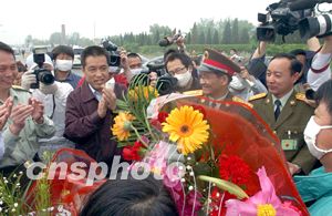 五月十五日清晨,解放軍總后勤部將官和北京市副市長張茅,歡迎小湯山醫院首批治療后康復的“非典”患者出院。作者:賈國榮