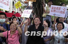 香港市民5月15日匯集在立法會外,高舉標(biāo)語“萬眾一心,抗御SARS”及支持特首董建華。中新社傳真 洪少葵 攝