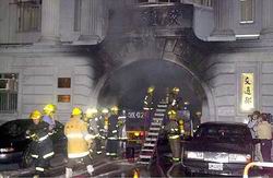 據(jù)了解,“交通部”的正門口15日晚間7時28分燃起熊熊大火,一輛掛在桃園龜山友立公司的小貨車,從桃源街又轉后即直沖“交通部”門口,駐守警衛(wèi)緊急聯(lián)絡消防人員,19輛消防車緊急趕往現(xiàn)場,火勢約在20分鐘內撲滅,辦公室內加班員工及數(shù)十名媒體記者所幸安然無恙,但“交通部”正門口已被兇猛的火勢燒得一片焦黑,火焰甚至高達4樓。