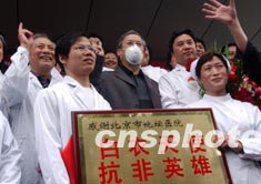 身染“非典”的著名電影導演謝飛經過二十多天的治療,十六日從北京地壇醫院康復出院前與大夫們合影留念。中新社記者:武仲林
