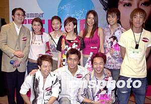 歌星黃伊汶5月21日在香港舉行新歌MV〔戒男〕首播禮,環(huán)球唱片高層陳小寶(左一)率領(lǐng)旗下眾歌星出席為黃伊汶打氣造勢(shì)。鄧慶樂 攝