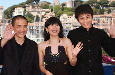 《紫蝴蝶》導演婁燁(左)、女演員章子怡及男演員劉燁(右)在戛納首映式上合影