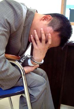 在公安局里接受訊問時,李忠文始終捂住自己的臉。王小華 攝