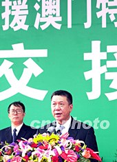 中央政府支援澳門抗擊非典型肺炎醫用物品交接儀式二十七日在拱北口岸舉行,全國政協副主席、港澳辦主任廖暉,澳門特區行政長官何厚鏵、中央駐澳聯絡辦主任白志健等出席儀式。中新社記者:李剛