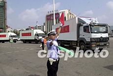 儀式結束后,滿載物資的運輸車輛開赴澳門。中新社記者:李剛