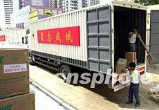 中央政府支援澳門抗擊非典型肺炎的醫用物品,二十七日運抵設在澳門旅游中心的“抗非典應變小組總指揮部”。中新社記者:李剛