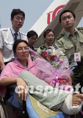 五月三十日,在阿爾及利亞地震中受傷的李燕斐等四名中國建筑工程總公司員工乘包機回到北京。在5月22日發生的阿爾及利亞地震中,共有9名中國人遇難,9人受傷。中新社記者 張煒 攝