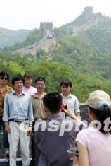 一些外地游客五月三十一日在北京八達(dá)嶺長(zhǎng)城上合影,留下美好瞬間。因北京非典疫情而冷清多日的一些著名景點(diǎn)隨著疫情的回落,開(kāi)始顯現(xiàn)旅游熱升溫跡象。中新社記者:毛建軍