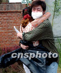 北京一位母親六月三日上午在小湯山戰地醫院門前,終于盼到患“非典”住院一個多月的兒子痊愈出院。母子激動擁抱,父親駕車等候身后,女友手捧鮮花站在旁邊。中新社記者:賈國榮