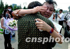 北京一位母親六月三日上午早早等候在小湯山戰地醫院門前,終于盼到患“非典”住院一個多月的兒子痊愈出院,母子迎面相見喜上心頭。中新社記者:賈國榮