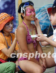 六月四日,香港赤柱舉行龍舟錦標賽,圖為美女“運動員”彩繪美體,盛裝出席龍舟賽。 中新社記者 潘索菲