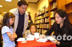 美籍女作家張純如新作《美國華人:口述歷史》簽名售書活動,四日晚在美西圣荷西的Barnes&Nobel書店舉行。她希望大家多買書送給圖書館,使更多人了解華人對美國的貢獻。圖為張純如為在硅谷一家高科技公司從事研發工作的唐若古先生及一雙兒女簽名。作者:陳鋼