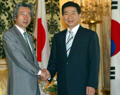日本首相小泉純一朗(左)和韓國總統(tǒng)盧武鉉(右)親切握手
