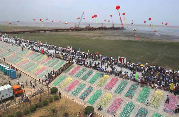 中新網6月8日電 杭州灣跨海大橋工程奠基儀式今天下午2時16分在慈溪市庵東鎮杭州灣大橋工程指揮部氣墊船專用碼頭舉行。