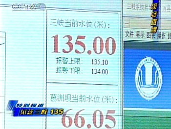 三峽水利樞紐梯級調(diào)度通信中心的大屏幕顯示水位達(dá)到135米。