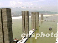 十一日,長江三峽永久船閘導航堤加緊安裝,確保準時通航。中新社圖