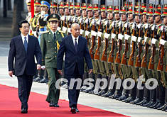 中共中央總書記、國家主席胡錦濤十二日在北京人民大會堂東門外廣場舉行儀式,歡迎來訪的老撾人民革命黨中央主席、國家主席坎代·西潘敦。中新社記者 毛建軍 攝