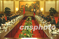 中共中央總書記、國家主席胡錦濤十二日在北京人民大會堂,與來訪的老撾人民革命黨中央主席、國家主席坎代·西潘敦舉行會談。中新社記者 毛建軍 攝
