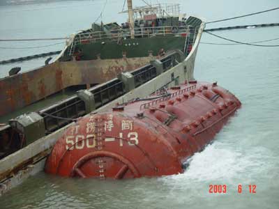 “華頂山”號(hào)沉沒后,海事部門決定采取“浮筒打撈法”,也就是將4只浮力總計(jì)2000噸的浮筒固定在沉船兩側(cè),然后向浮筒內(nèi)注入壓縮空氣,讓沉船與浮筒一起浮出水面。經(jīng)過救撈人員連續(xù)數(shù)日的緊張調(diào)試安裝,昨天下午,壓縮空氣被注入浮筒,沉默在水中15天的“華頂山”號(hào)終于慢慢浮出水面。(劉立忠、王蔚然)