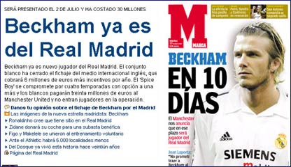 英國報紙指出,貝克漢姆轉會皇馬有眾多先兆