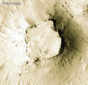 這是美國宇航局六月十六日公布的“火星環球勘測者”號探測器拍攝的火星地貌照片。照片上顯示一處小型環形臺地,周圍是塵土覆蓋的小丘及波紋狀平原,臺地的斜坡上布有塊狀浮石。