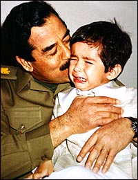 當(dāng)薩達(dá)姆熱吻孫子阿里的臉的時(shí)候,阿里被嚇哭了,因?yàn)闋敔斂雌饋?lái)是真想親他,可孩子有一點(diǎn)害怕。