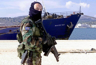 6月23日,一名希臘特種兵在一艘被查獲的輪船附近警戒