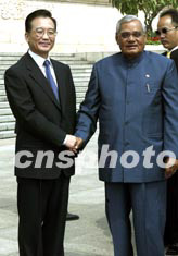 國務院總理溫家寶二十三日在北京歡迎到訪的印度總理瓦杰帕伊。中新社記者:鄭萍萍
