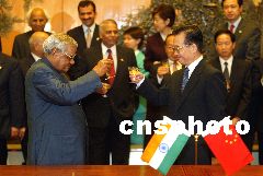 中國(guó)總理溫家寶與印度總理瓦杰帕伊二十三日上午在北京人民大會(huì)堂舉行會(huì)談,并出席中印關(guān)于簡(jiǎn)化簽證手續(xù)的諒解備忘錄等九個(gè)文件的簽字儀式。圖為溫家寶與瓦杰帕伊舉杯共賀。中新社記者 毛建軍 攝
