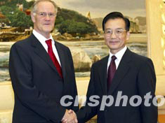 中國國務院總理溫家寶二十三日在北京會見加拿大外長威廉·格雷厄姆。中新社記者 滿會喬