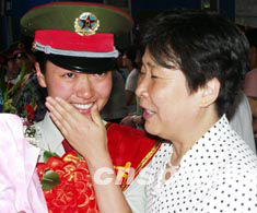 六月二十四日,完成北京小湯山戰地醫院抗擊非典任務的蘭州軍區白衣戰士凱旋。在蘭州車站,一位母親為女兒擦去激動的淚水。 作者:楊曉波
