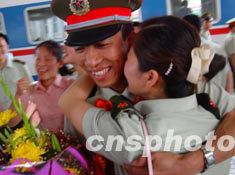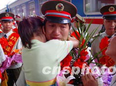 完成北京小湯山戰地醫院抗擊“非典”任務的蘭州軍區白衣戰士二十四日順利回到蘭州。在蘭州車站,一名軍醫與家人久別重逢,不禁熱淚盈眶。作者:杜洋