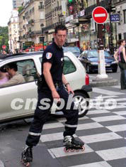 2003年6月的法國巴黎,天氣晴朗,一名警察腳踏排輪穿梭街道巡邏,以快速應變狀態對付罪案發生。盧峰 攝