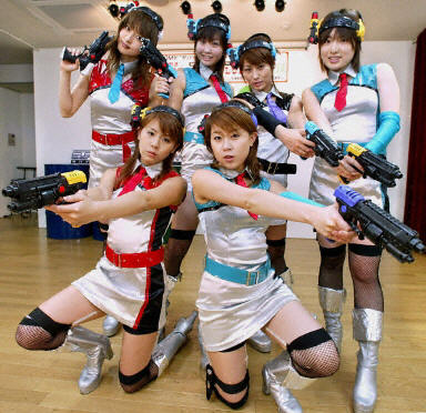 28日,日本青春少女為TOMY玩具公司新近推出的紅外玩具槍在東京做促銷。這種叫作'Survivor Shot Revolv'的紅外玩具槍還包括一個(gè)無線接收器,日本市場售價(jià)2580日元(25美元)