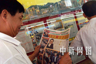 香港媒體關(guān)注國(guó)務(wù)院總理溫家寶訪港。香港媒體關(guān)注中國(guó)國(guó)務(wù)院總理溫家寶訪港,29日?qǐng)?bào)刊雜志頭條刊登新聞,市民駐足瀏覽。中新社記者洪少葵攝