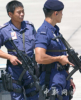 中國國務院總理溫家寶,六月二十九日中午乘專機抵達香港國際機場,在香港進行為期三天的訪問。圖為香港國際機加強警戒。中新社記者 錢興強 攝