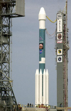 6月28日,在美國佛羅里達州卡納維拉爾角發射基地,德爾塔2型火箭已做好發射準備。美國宇航局計劃當天(美國東部時間28日晚)將“機遇”號火星車發射升空。