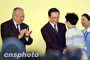 國(guó)務(wù)院總理溫家寶6月30日出席表?yè)P(yáng)醫(yī)護(hù)人員成功抗炎大會(huì),向在抗擊SARS中以身殉職的醫(yī)護(hù)人員家屬表示慰問(wèn)。洪少葵 攝