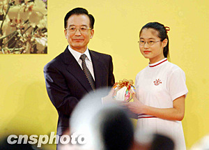 國(guó)務(wù)院總理溫家寶6月30日香港表?yè)P(yáng)醫(yī)護(hù)人員成功克服SARS聚會(huì)上,接受香港學(xué)生贈(zèng)送紀(jì)念品。洪少葵 攝