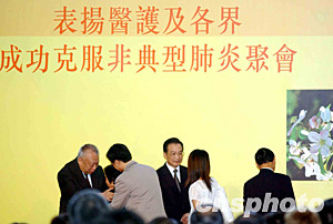 國(guó)務(wù)院總理溫家寶6月30日在香港表?yè)P(yáng)醫(yī)護(hù)人員成功克服SARS聚會(huì)上,表彰醫(yī)護(hù)界、科研界、志愿機(jī)構(gòu)、政府部門(mén)和學(xué)校的代表,并慰問(wèn)因公殉職的謝婉雯醫(yī)生、護(hù)士劉永佳等家人。洪少葵 攝
