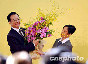 國(guó)務(wù)院總理溫家寶6月30日在香港出席表?yè)P(yáng)醫(yī)護(hù)人員成功抗炎大會(huì)時(shí),接受醫(yī)護(hù)人員獻(xiàn)花,總理溫家寶隨即將花轉(zhuǎn)送在抗擊SARS中殉職的醫(yī)護(hù)人員家屬時(shí),受到在場(chǎng)人士的陣陣掌聲。洪少葵 攝