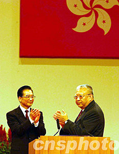 香港灣仔金紫荊廣場今早舉行升旗儀式。當國務院總理溫家寶在特區行政長官董建華陪同下步入廣場時,全場響起熱烈的掌聲。升旗儀式有三千名嘉賓參加,由香港警察銀樂隊奏樂。