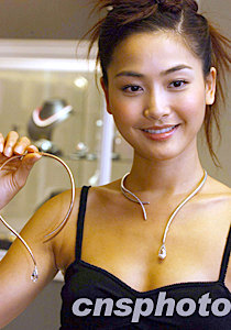 香港名模周汶(金+奇)七月三日在香港展示一顆重達十五點五七卡拉淺粉紅色全美鉆石吊膽,該鉆石將于七月八日在香港佳士得2003年瑰麗珠寶及翡翠首飾春季拍賣會上拍賣,估價約三百萬以上。中新社記者潘索菲攝
